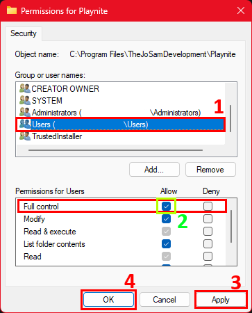- Select the Group "Users" in the Top half and check "Full Control" in the bottom